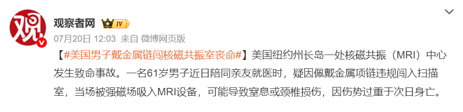 前阵子美国就发生了一起戴金属链闯核磁共振室丧命的新闻: