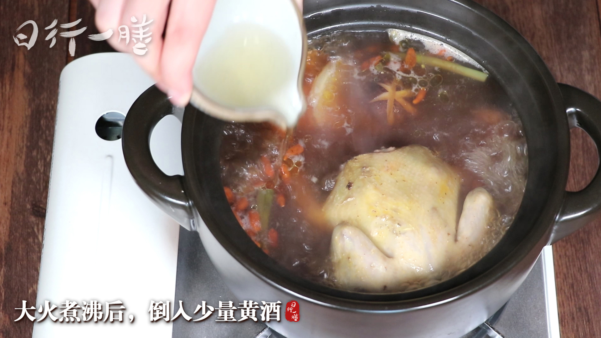 5、大火煮沸后,倒入少量黄酒