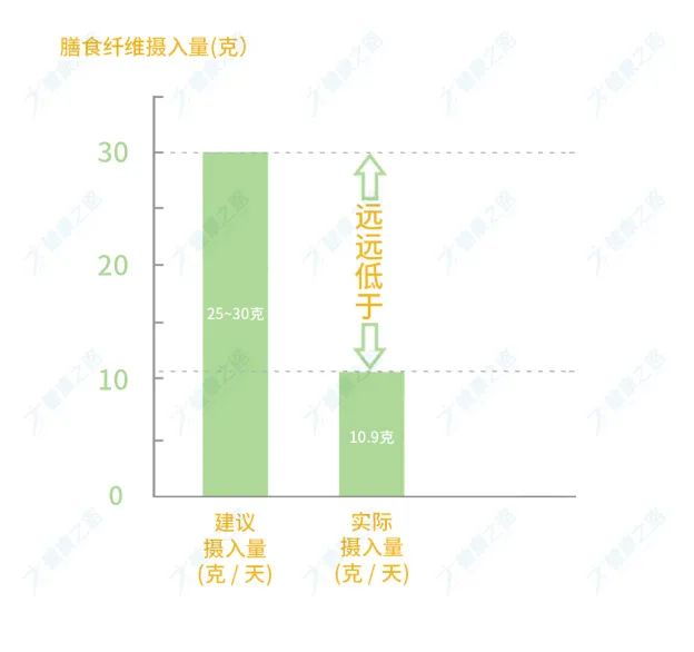 根据中国营养学会建议,成年人膳食纤维摄入量应达到25~30g/天。但根据中国疾病预防控制中心调查显示,我国居民的膳食纤维摄入量仅为10.9g/天,远远低于标准量。