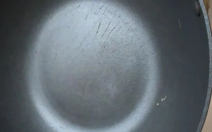 倾斜锅具,对着阳光/灯光看锅面,只要有一点点划痕/掉漆就要立刻换!