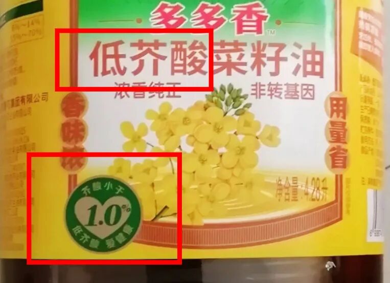 菜籽油里的芥酸不易被人体消化,所以含量越低越好,国标规定芥酸含量要低于3%,咱就选低于1%的。