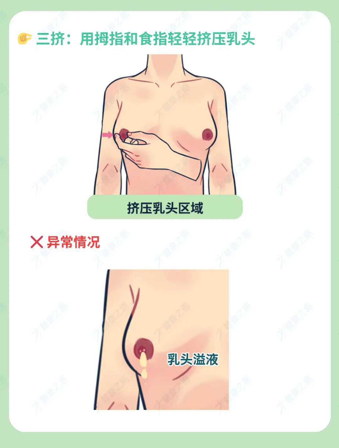 自检方法很简单,记住 “一看二摸三挤” 这六字口诀就行: