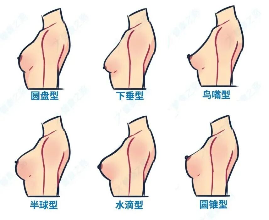 事实上,女性的乳房形态,主要受遗传、种族等先天因素影响,是身体自然发育的结果,并无优劣之分,大致可分为以下6种类型: