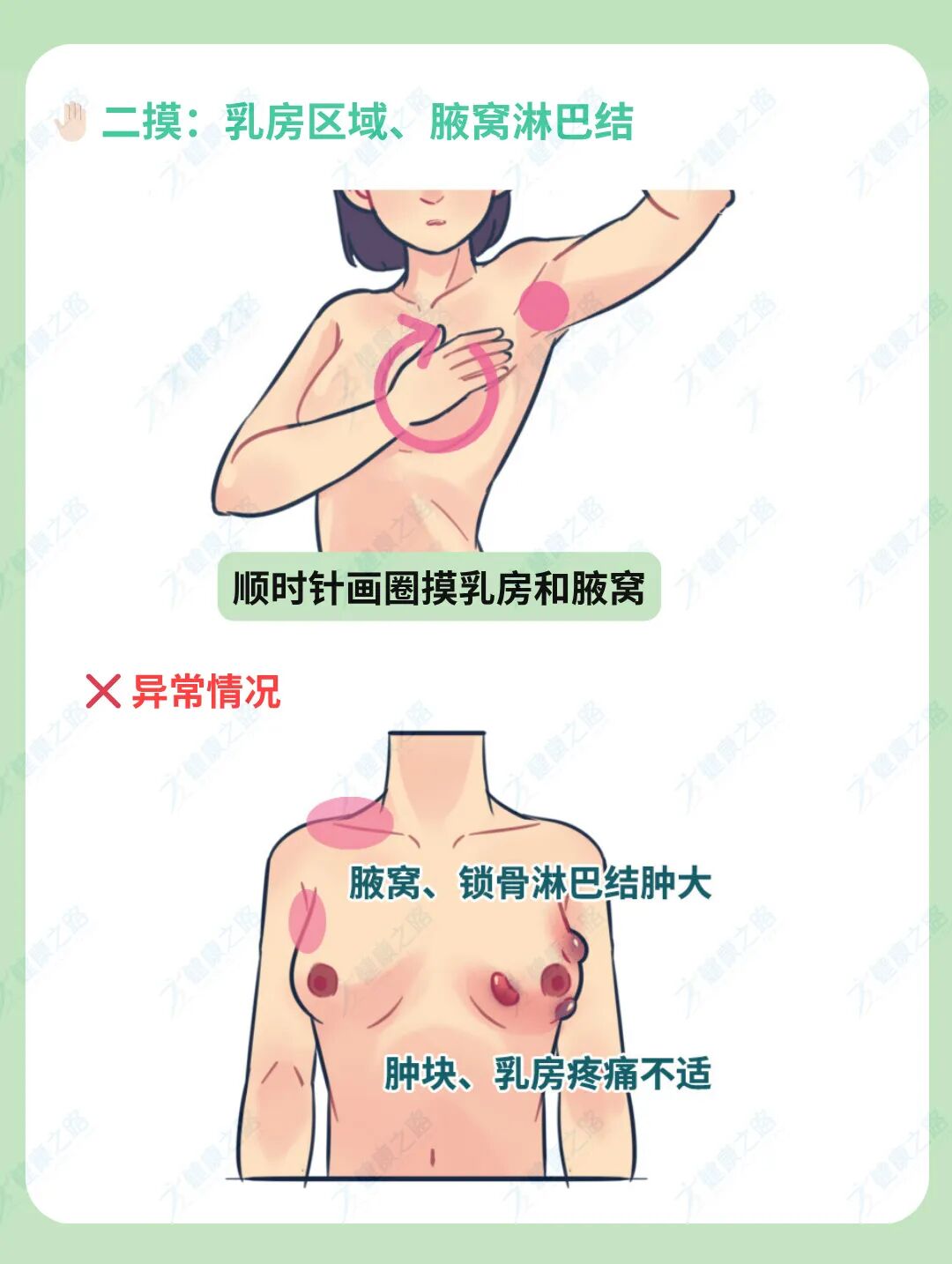 因此,定期自检是发现乳房异常的最好办法,建议女性朋友在每次月经结束后7-11天进行自检(已绝经的女性,可固定每月某一天进行)。