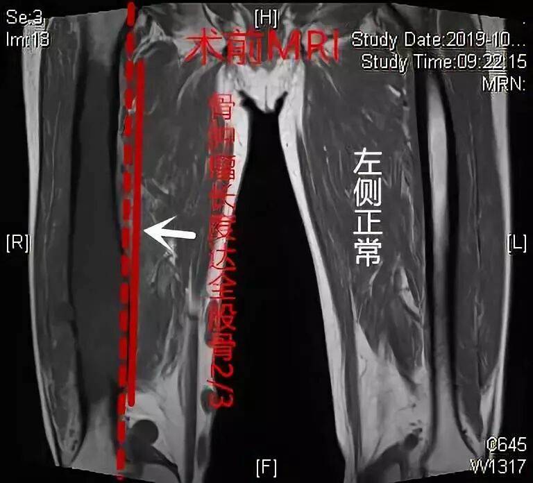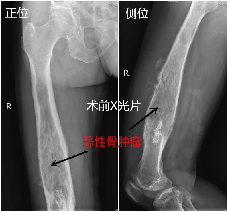 两周前,南平市72岁的依伯经介绍来我科就诊。依伯右大腿疼痛1年多,当地医院考虑腰椎间盘突出,经止痛、针灸等治疗,疼痛无明显缓解。2个月前疼痛加重,行走时明显,以夜间疼痛为主,伴肿胀感,严重影响睡眠。当地医院X片提示:右侧股骨干破坏,考虑恶性骨肿瘤。入住我院后进一步查MRI及CT均考虑恶性骨肉瘤,并侵犯2/3股骨全长,经活检病理确诊:软骨肉瘤。目前国内外对此病理类型的肿瘤放化疗均不敏感,手术完整切除成了此类患者最好的治疗手段。股骨是全身最容易发生原发性和继发性肿瘤的长骨之一,手术保肢的患者在肿瘤切除后需要进行股骨重建。全股骨置换术在切除肿瘤的同时可以重建股骨的完整性,保留了下肢的运动和负重功能,避免了截肢,患者更能接受。同时有研究表明,肿瘤侵犯股骨,截肢并未增加患者的生存率。